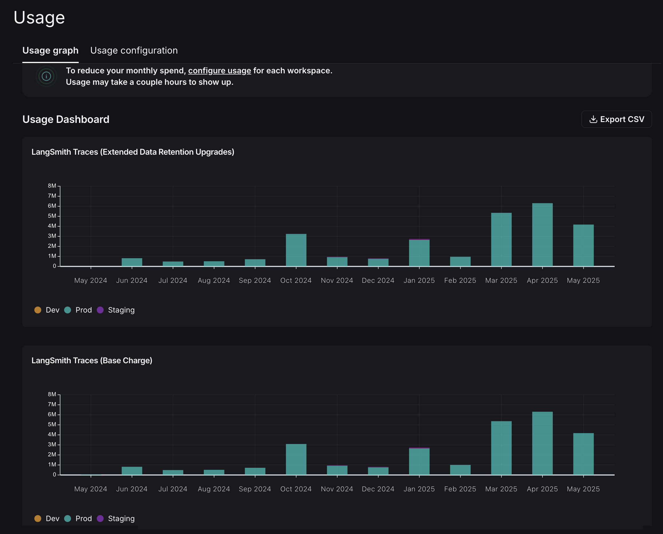 The first step of any optimization process is to understand current usage. LangSmith provides two ways to do this: Usage graph and Invoices.Usage graph