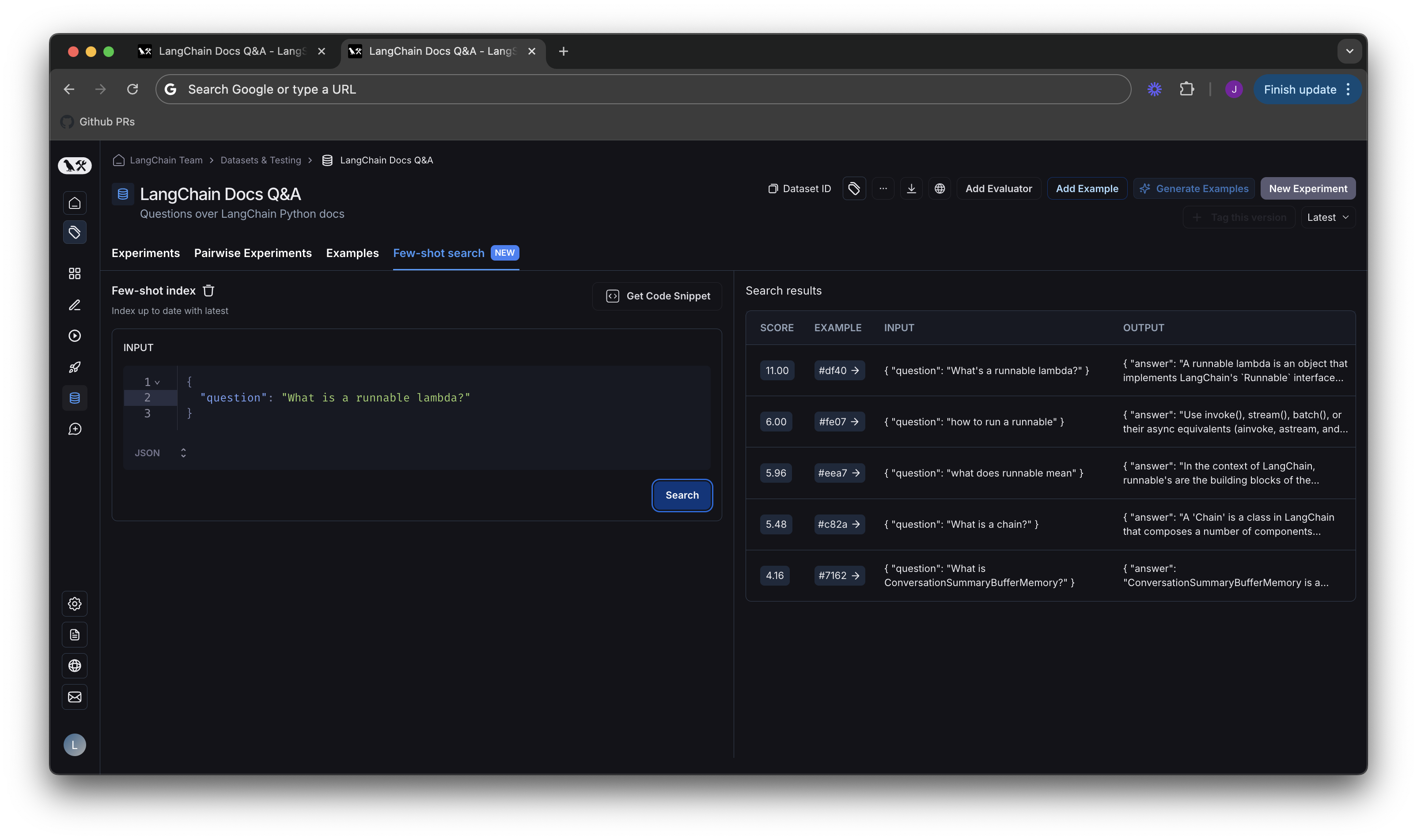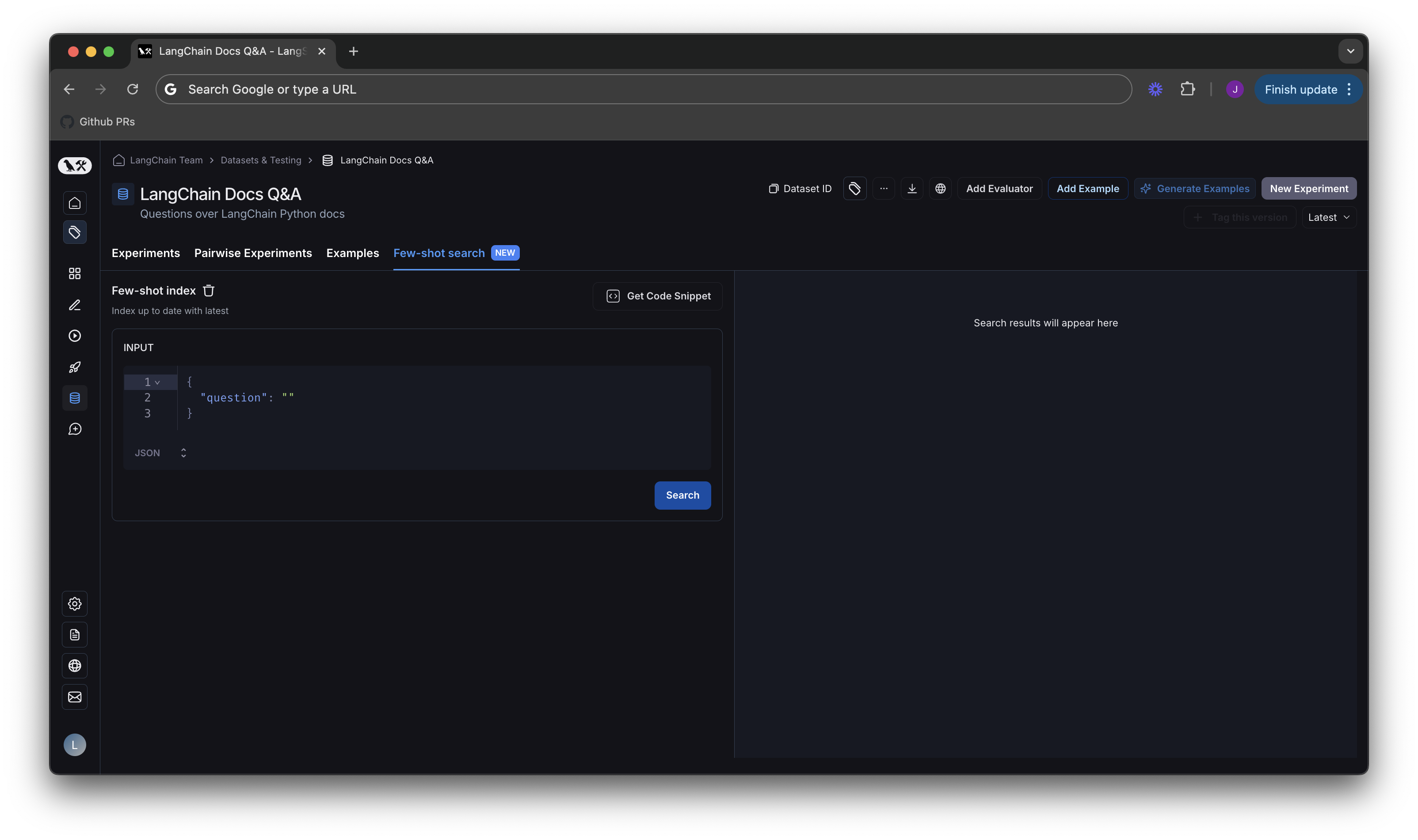 Click the Get Code Snippet button in the previous diagram, you’ll be taken to a screen that has code snippets from our LangSmith SDK in different languages. For code samples on using few shot search in LangChain python applications, please see our how-to guide in the LangChain docs.
