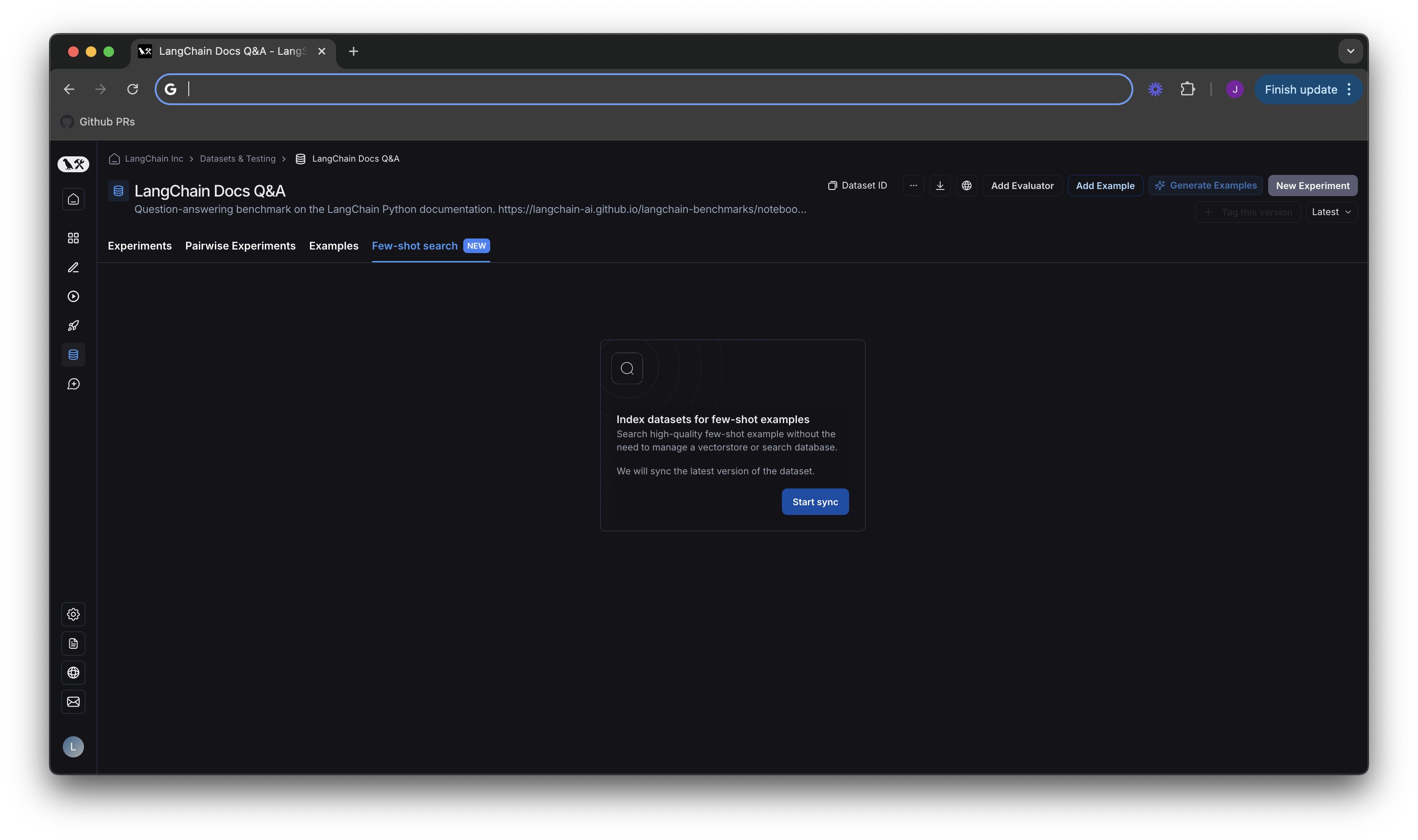 Navigate to the datasets UI, and click the new Few-Shot search tab. Hit the Start sync button, which will create a new index on your dataset to make it searchable. By default, we sync to the latest version of your dataset. That means when new examples are added to your dataset, they will automatically be added to your index. This process runs every few minutes, so there should be a very short delay for indexing new examples. You can see whether your index is up to date under Few-shot index on the lefthand side of the screen in the next section.